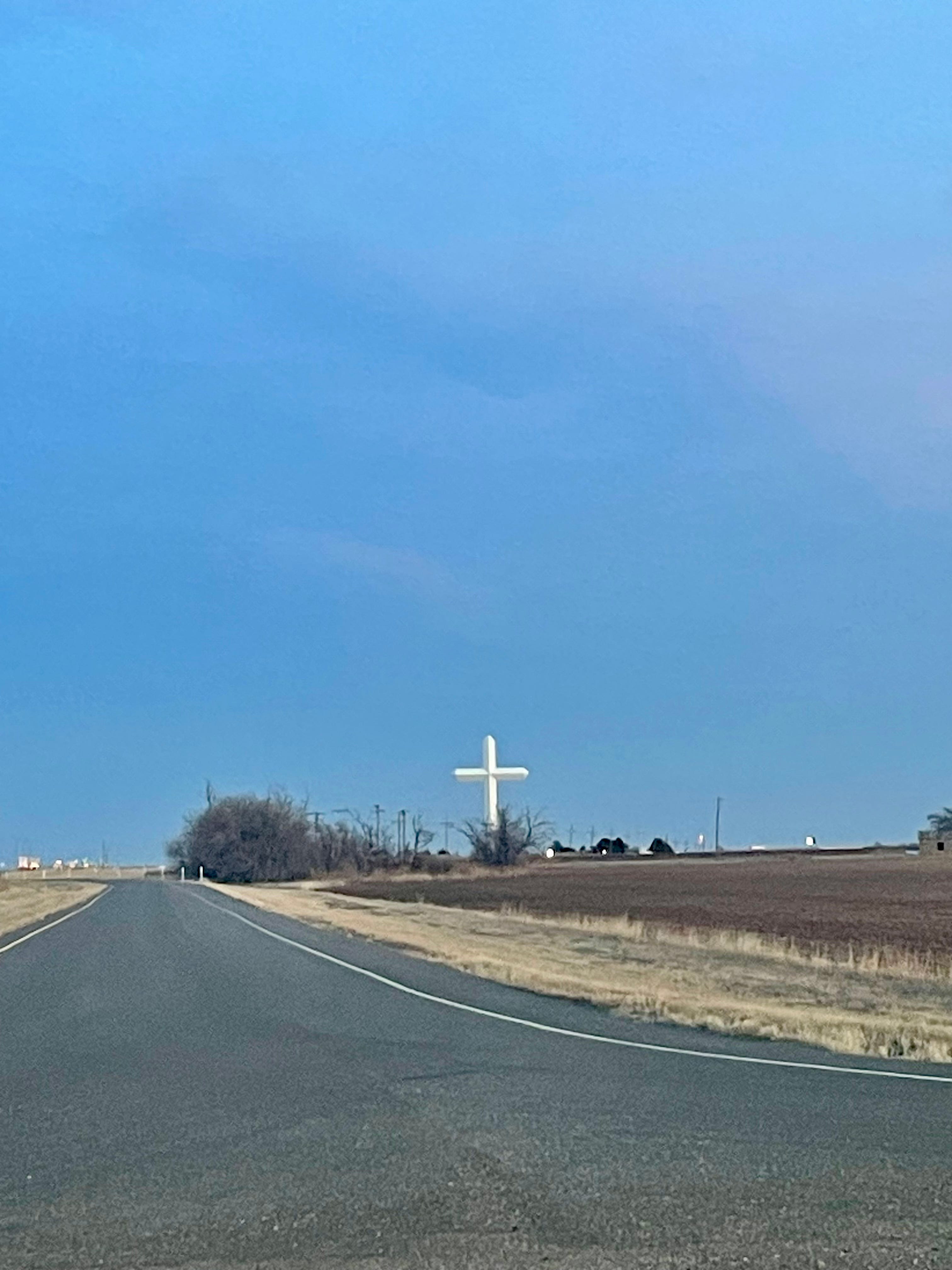 On my second night of driving back home, I approached The Cross of Our Lord Jesus Christ, a 190 foot tall free standing cross off the highway 40 miles east of Amarillo, Texas. On my way to Kentucky, I had seen the cross on the morning of my second day of driving aand found it to be obscene and garish, but on the way back–at sunset, after feeling all the things I had felt on the trip home, the cross had a weight that made me turn off the music and breathe heavily. I pulled off the interstate not far from the cross and took photos of the cross against the horizon with the sun setting over a cold Texas emptiness. The cross had transformed from a garish and grotesque symbol into one of hope and persistence.