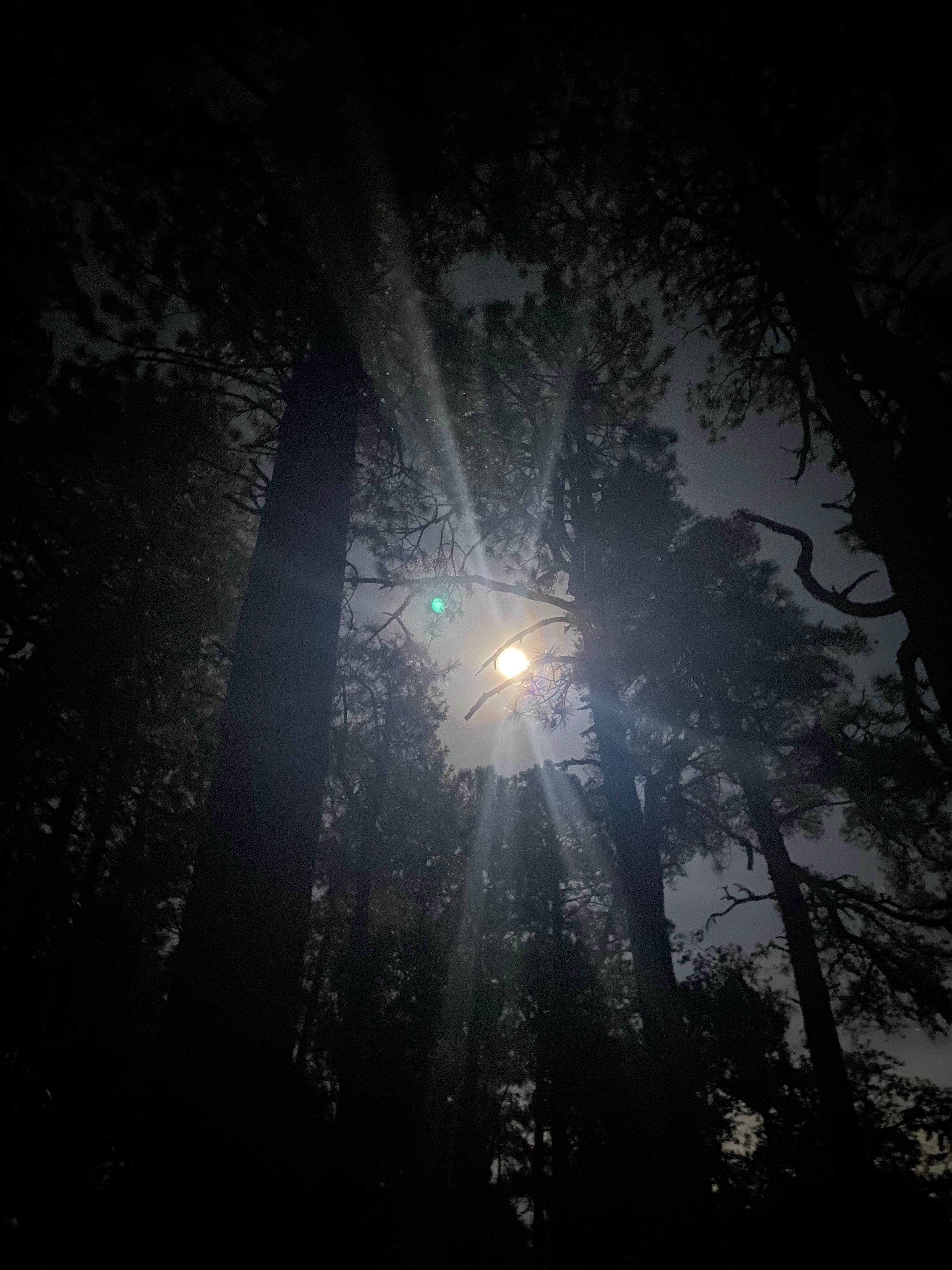 Sleep was not easy as both Daphne and I were restless for much of the night, but just before midnight a brilliant white light woke us both from sleep. It was so bright I thought that someone was at our campsite or that I had left the lantern on. I unzipped the tent and stumbled out to see the moon, brilliant and full in the east, cresting the distant mountains through the trees.