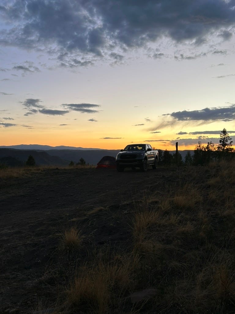 Some light rain moves in eventually, so the husky and I retreat to the pickup to wait for it to pass. When it does, I set out my chair and read a book as the husky sleeps at my feet. Itās around 5:30 in the afternoon, and Iāll need to set up for the night soon. Iām contemplating whether I should set up a hammock in the woods, sleep in the back of the truck, or put my tent on top of the makeshift table. My lack of sleep is catching up to me and I know itās going to be an early night whatever I decide.