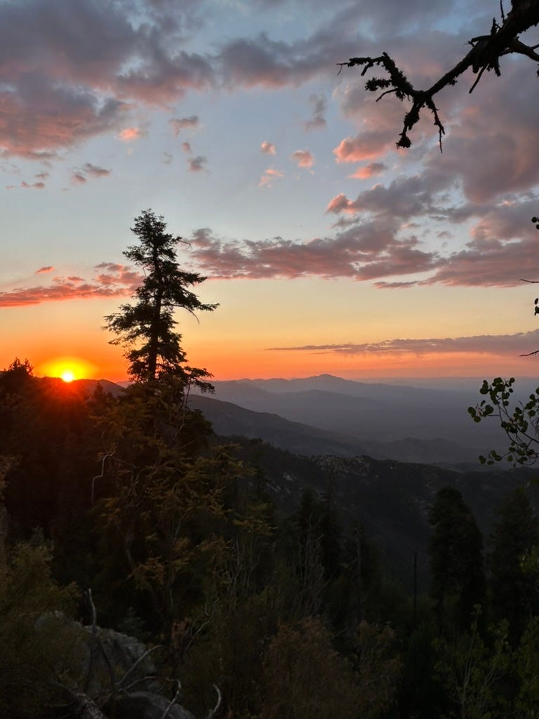 After our hike, we find a winding forest service road with a canyon drop-off on one side and wooded spots with occasional camp sites on the other. We drive for several miles, passing dispersed campsites but none of them feel quite right. Playfully, I visualize a ball of light and say: āperfect camping we will find.ā I release the image as we round a corner where a secondary, less-developed forest service road splits off. We climb a short embankment, and at the top is a huge rock fire pit, a concrete slab supported by two tree stumps, in an open clearing with rock walls and trees all around. I have hit the dispersed camping jackpot.